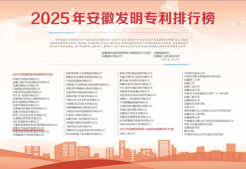 近日,安徽省市場監督管理局(安徽省知識產權局)、安徽省教育廳、安徽省科學技術廳、安徽省工業和信息化廳聯合發布“2025年安徽發明專利排行榜”,安徽叉車集團憑借卓越的創新能力與知識產權優勢,成功入選安徽省制造業發明專利50強。 作為工業車輛行業的...